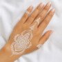 White henna is usually made from body paint, cosmetic adhesive, and mica powder or body glue, all dermatologically tested for temporary skin decoration. It sits beautifully on the skin, appearing bright white with a matte or pearl finish — perfect for brides, photoshoots, and elegant occasions.